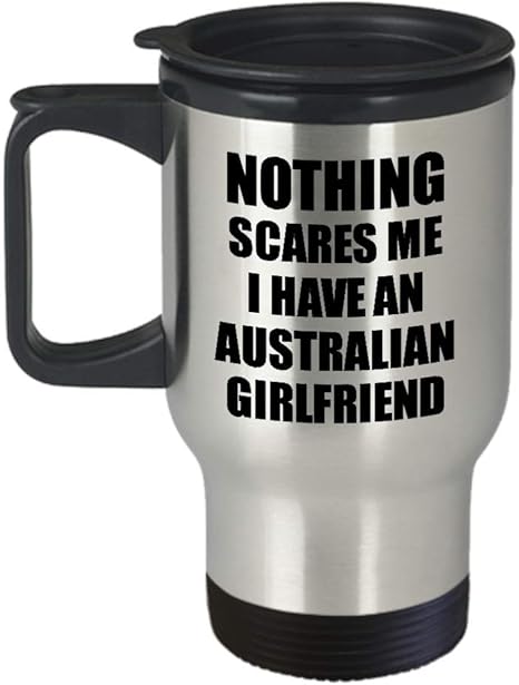 Amazon Com Australian Girlfriend Travel Mug Funny Valentine Gift For Bf My Boyfriend Him Australia Gf Gag Nothing Scares Me 14 Oz Insulated Lid Commuter Kitchen Dining